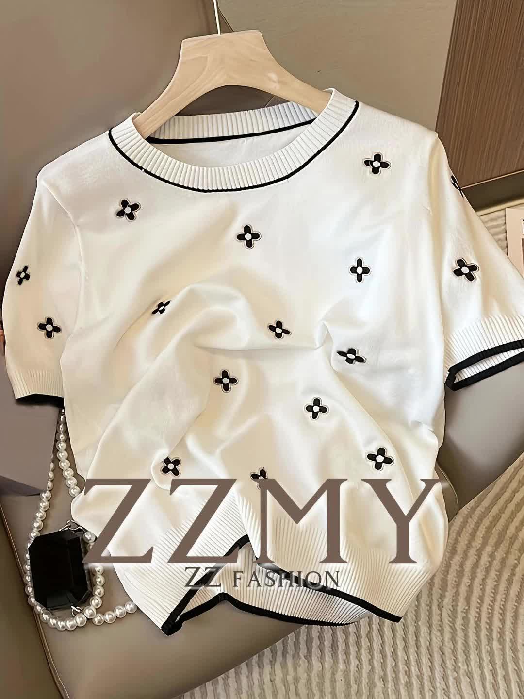 Women's Casual Short Sleeve Top - Relaxed Fit Round Neck Color-Block Contrast with Black Embroidered Geometric Pattern, Lightweight Breathable All-Season Versatile Shirt, Short Sleeve Blouse, Everyday Fashion, Minimalist Design, Nontransparent FabricWomen's Casual Short Sleeve Top - Relaxed Fit Round Neck Color-Block Contrast with Black Embroidered Geometric Pattern, Lightweight Breathable All-Season Versatile Shirt, Short Sleeve Blouse, Everyday Fashion, Minimalist Design, Nontransparent FabricWomen's Casual Short Sleeve Top - Relaxed Fit Round Neck Color-Block Contrast with Black Embroidered Geometric Pattern, Lightweight Breathable All-Season Versatile Shirt, Short Sleeve Blouse, Everyday Fashion, Minimalist Design, Nontransparent Fabric