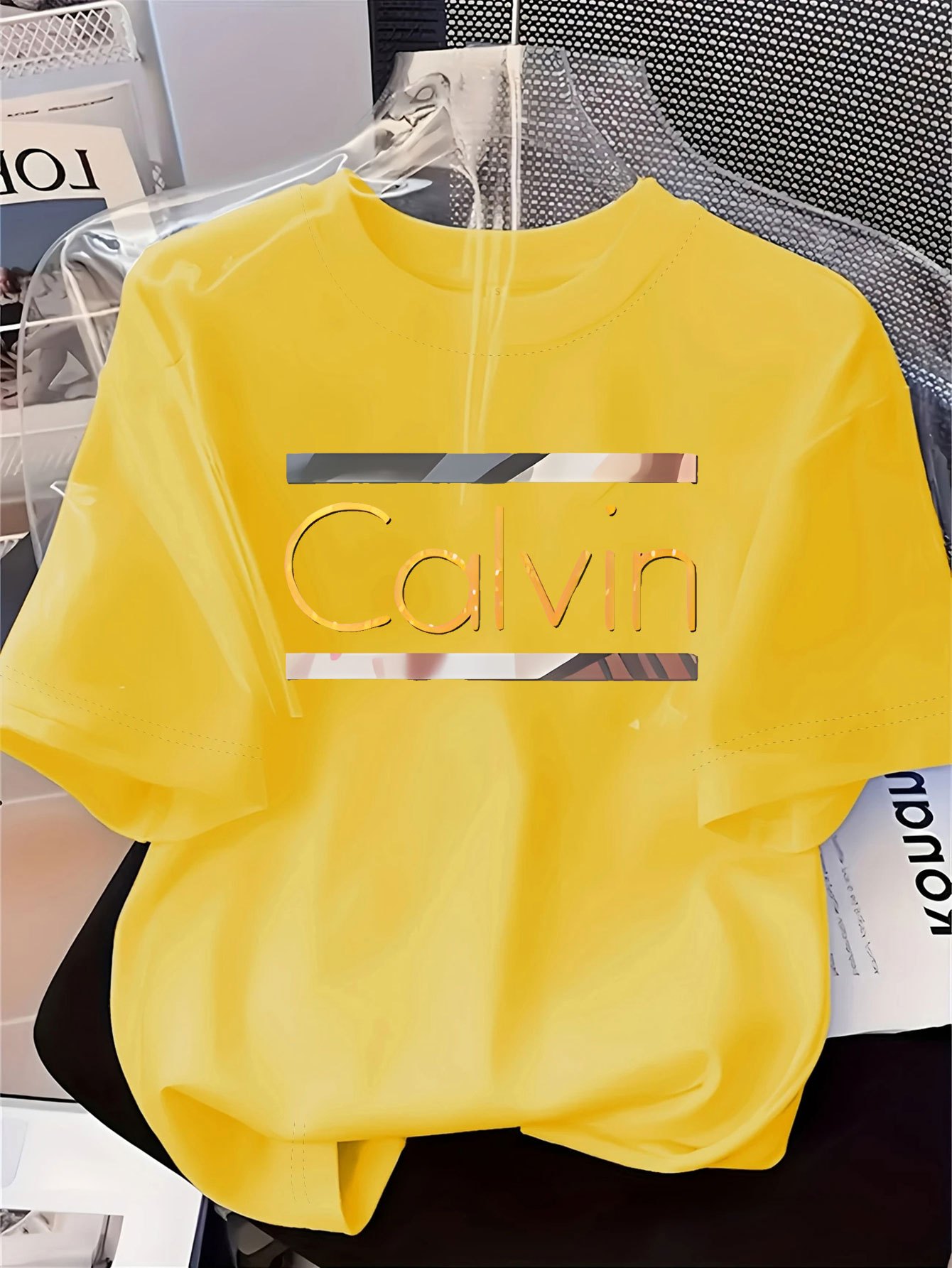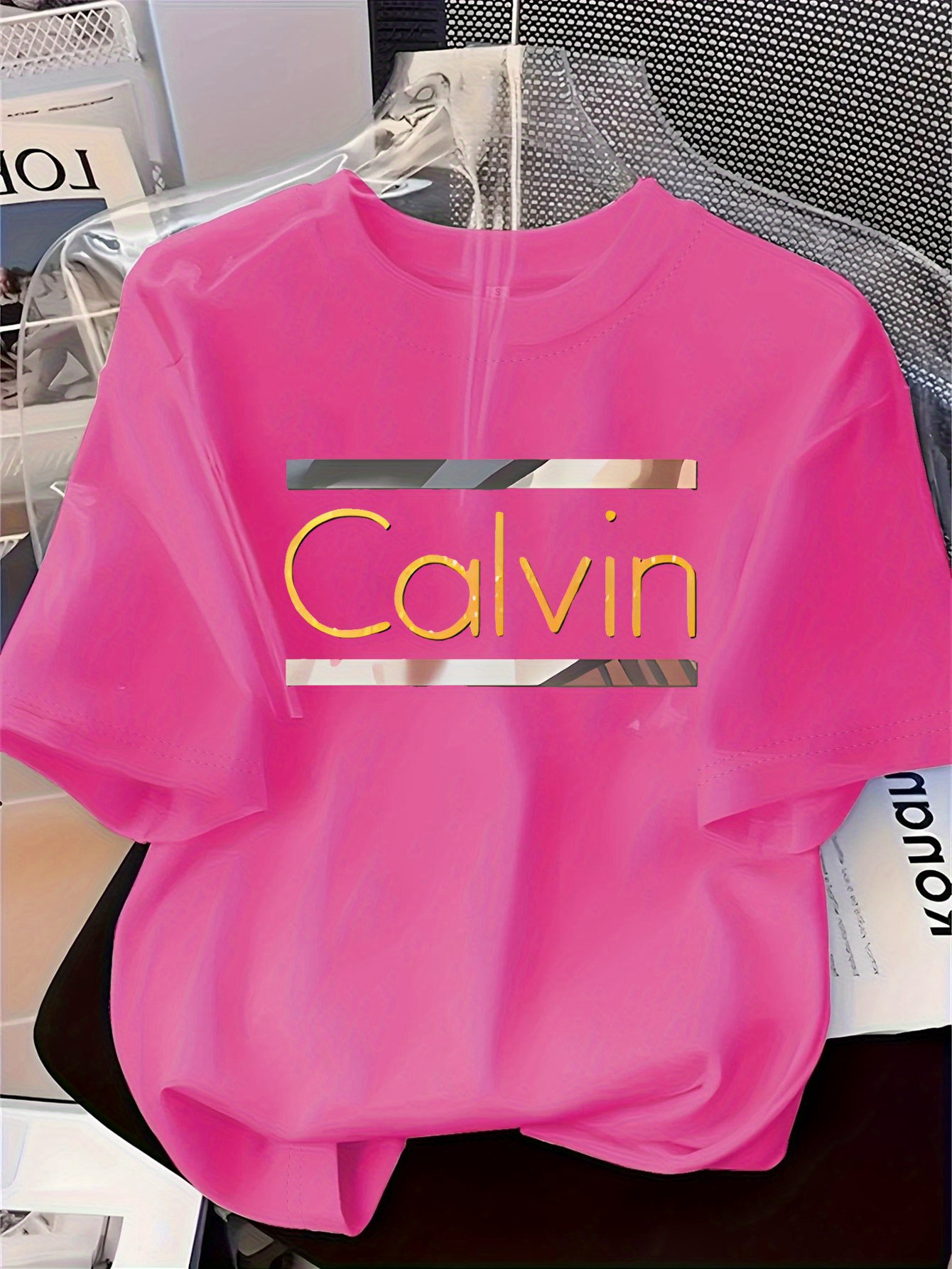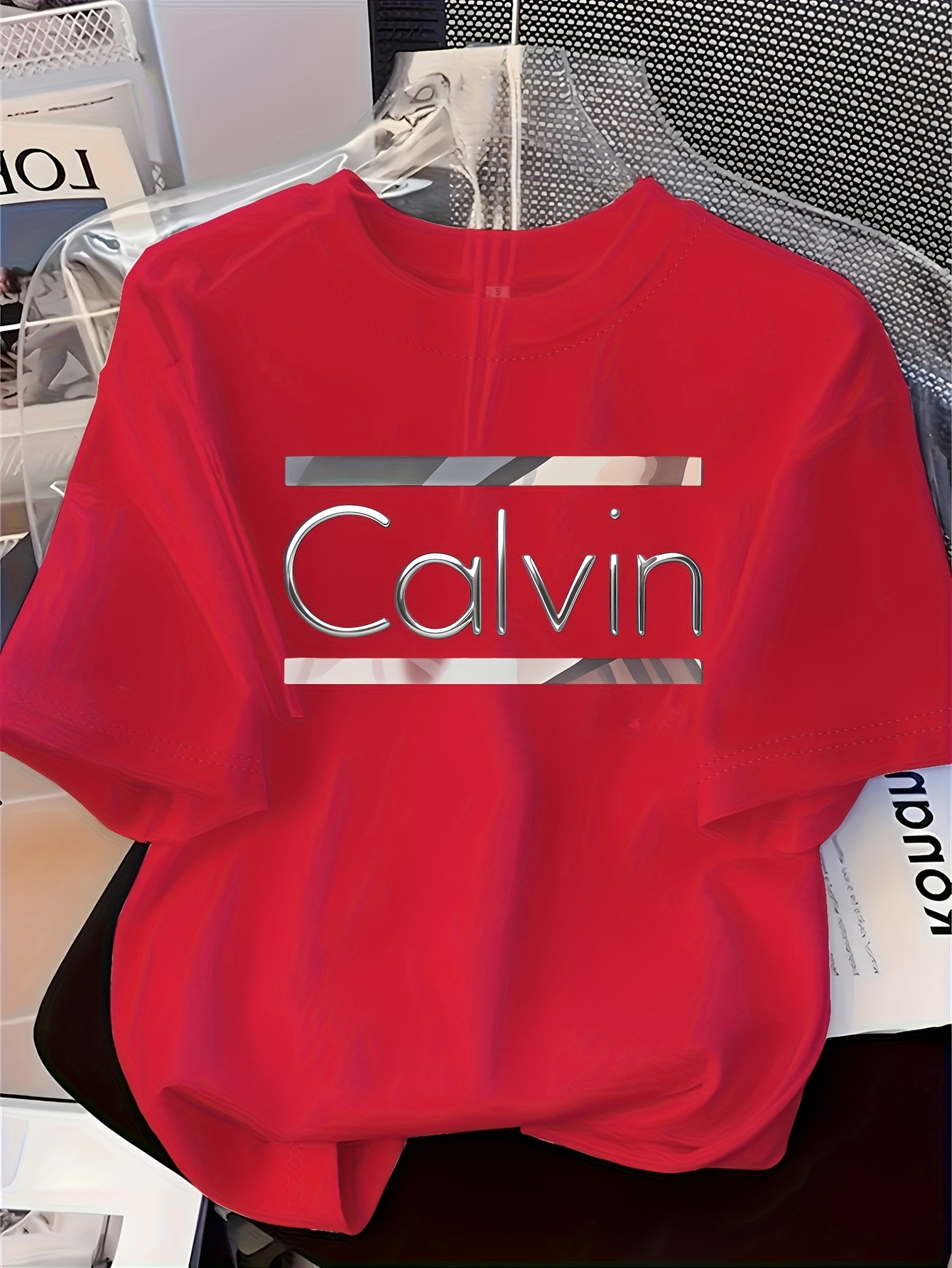Women’s Elegant Round Neck Short-Sleeve T-Shirt – Vibrant Red with White Calvin Monogram Print, Soft Fabric, Casual Versatile Top for Spring & Summer, Machine Washable, Casual Attire, Stylish Letter Print, Comfortable Fit