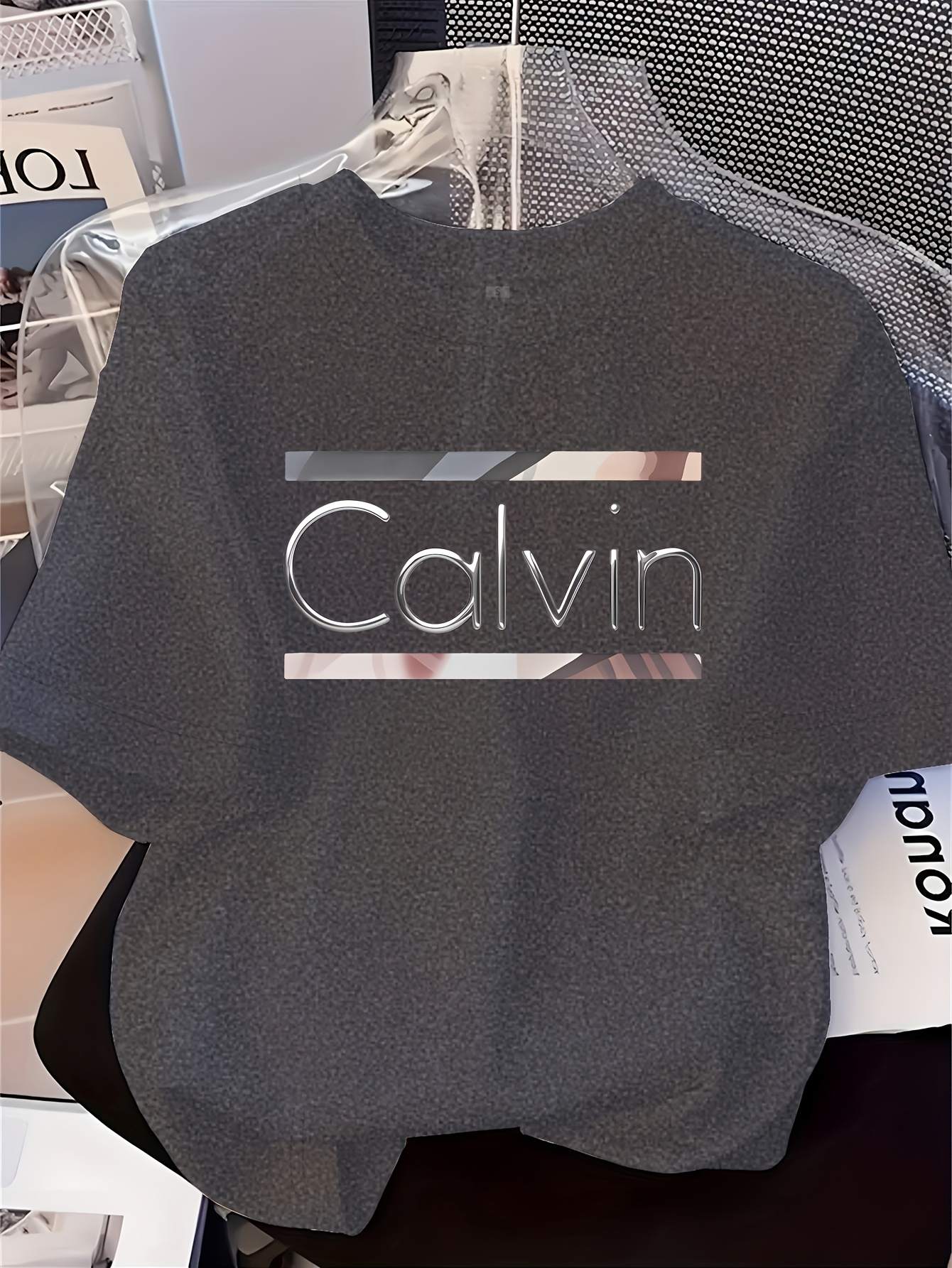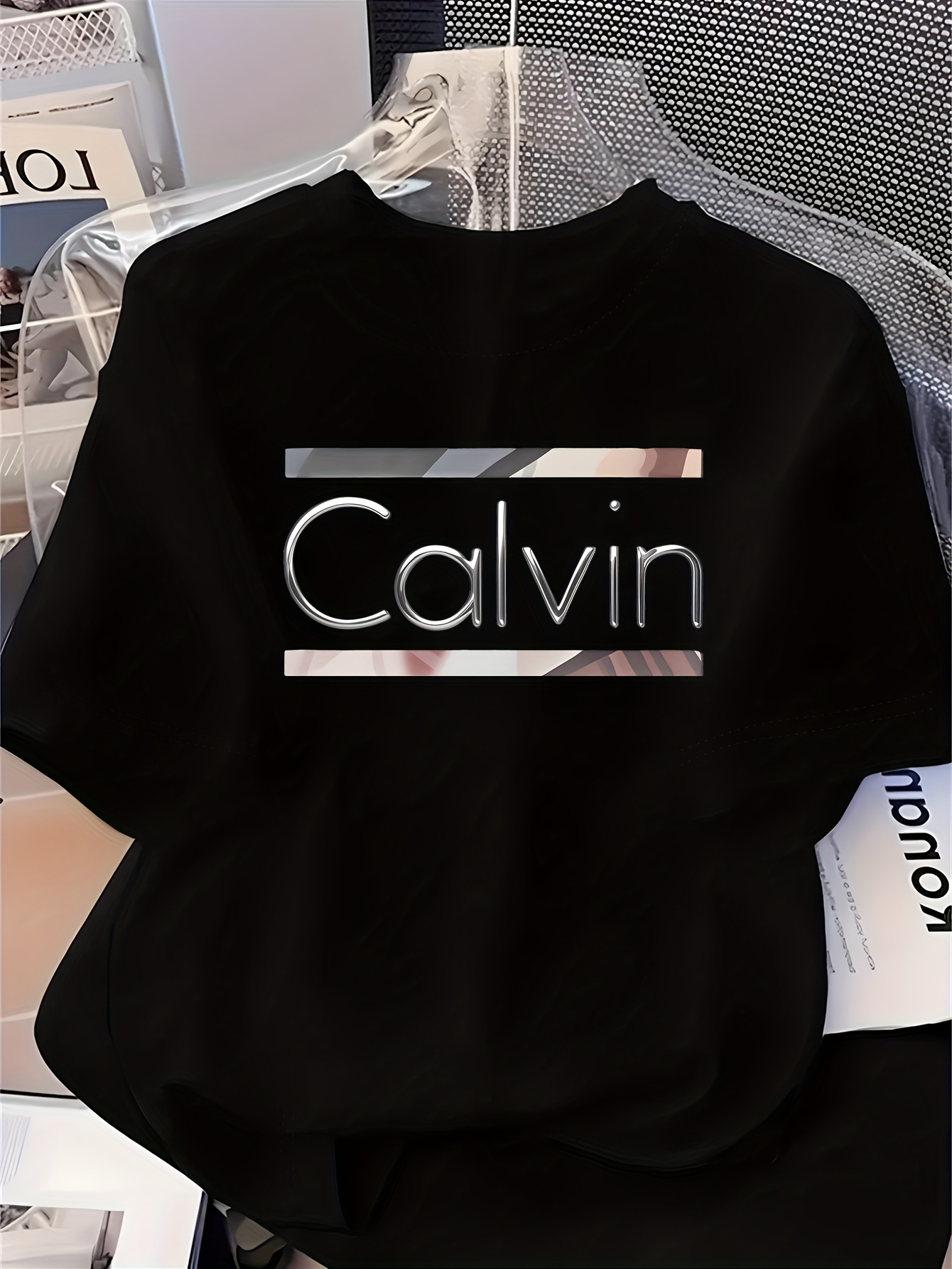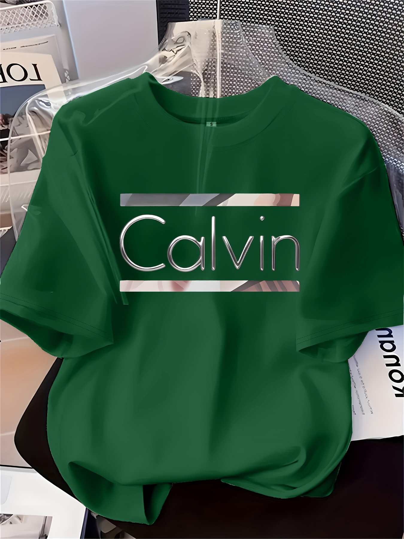 Women’s Elegant Round Neck Short-Sleeve T-Shirt – Vibrant Red with White Calvin Monogram Print, Soft Fabric, Casual Versatile Top for Spring & Summer, Machine Washable, Casual Attire, Stylish Letter Print, Comfortable Fit